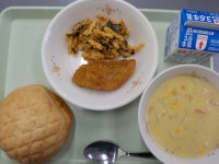 メロンパン牛乳たらのさくさくフライマカロニソテーコーンミルクスープ きた、、、。...