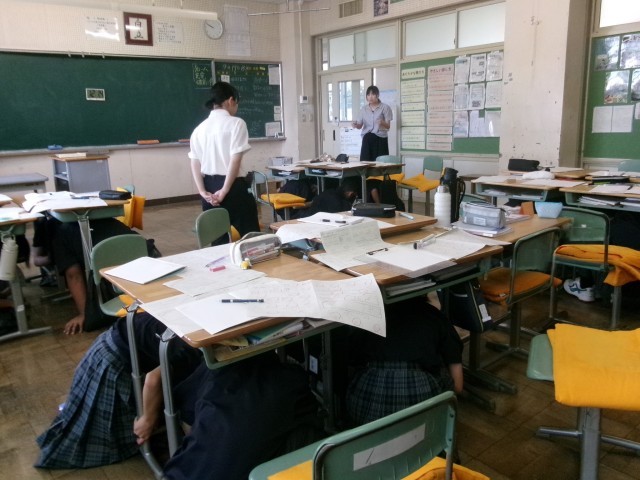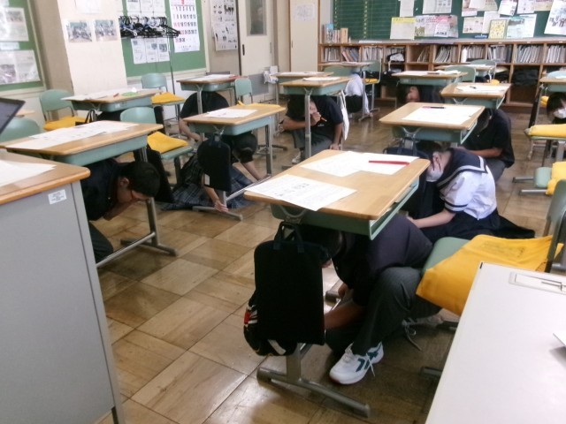 17日午前の授業中に、地震を想定した抜き打ちの避難訓練を実施しました。まずは机の下に潜りました。