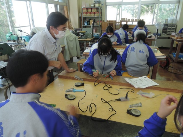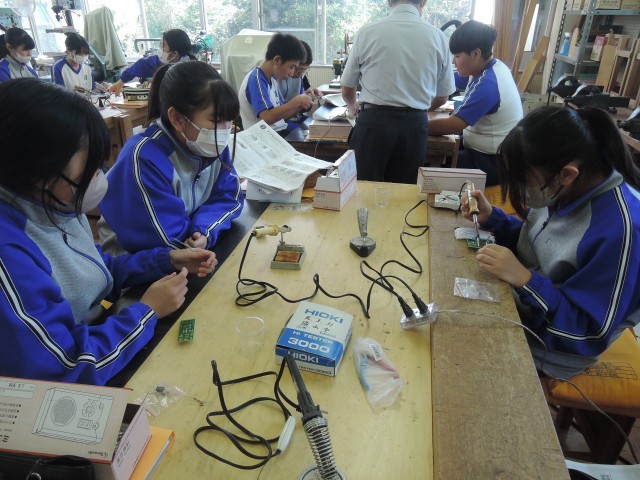2年生の技術ははんだ付けです。はんだが上手に溶けずに苦労している生徒もいました。