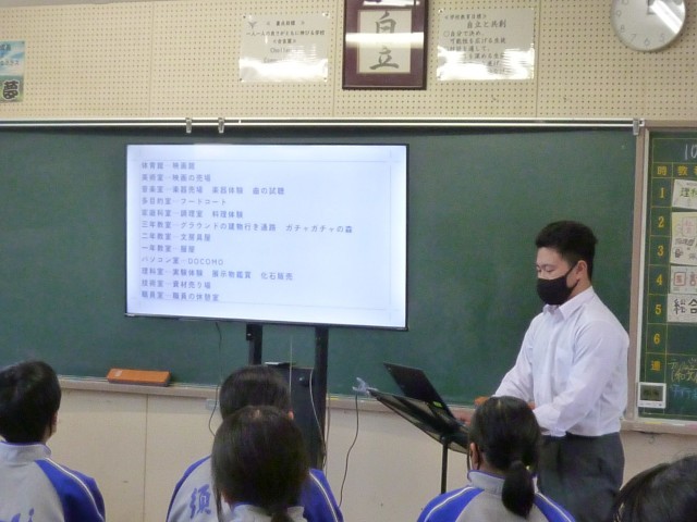 10月30日(木)に「ワークショップデイ」=3年生による地域への提案、を開催しました。観光、料理、施設建設など地域の活性化をはかるアイデアを考え、聴く人をひきつけるように工夫してプレゼンテーションを行いました。