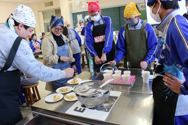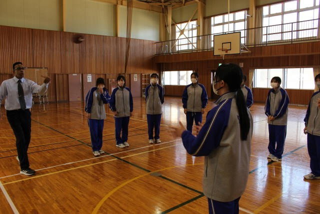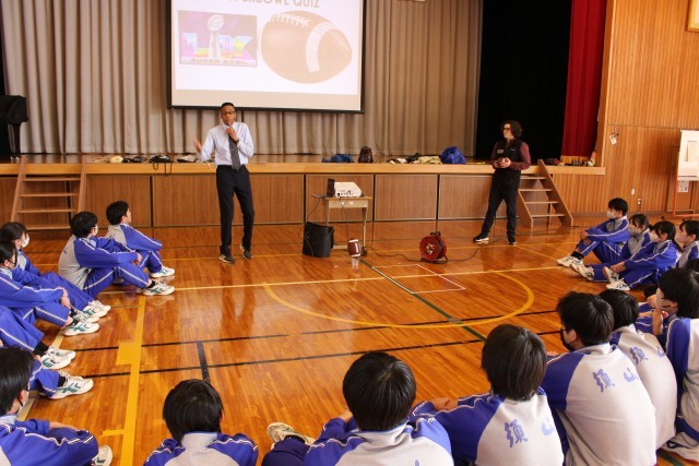 19日(木)に市内のALTが須山中に集合して、「須山イングリッシュ・デイ」が行われました。生徒がいくつかのグループに分かれて、ALTに校舎の案内をしたり、日本の文化について説明したりしました。ALTからは、アメリカンフットボールをレクチャーしてもらったり、カナダの郷土料理を教わり一緒に作って食べたりしました。