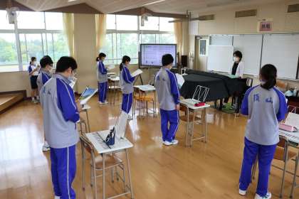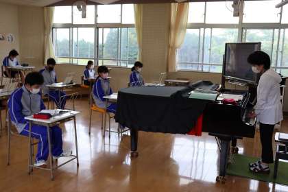 2校時の音楽の授業です。「野の道」や「水芭蕉」って何かを考えながら合唱をしていました。